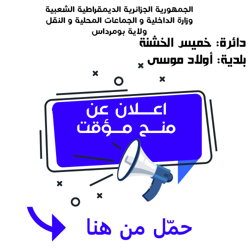 يعلن السيد رئيس المجلس الشعبي البلدي لبلدية أولاد موسى عن منح مؤقت لإنجاز جدار ايحاطة بمدرسة تبوكيوت رابح