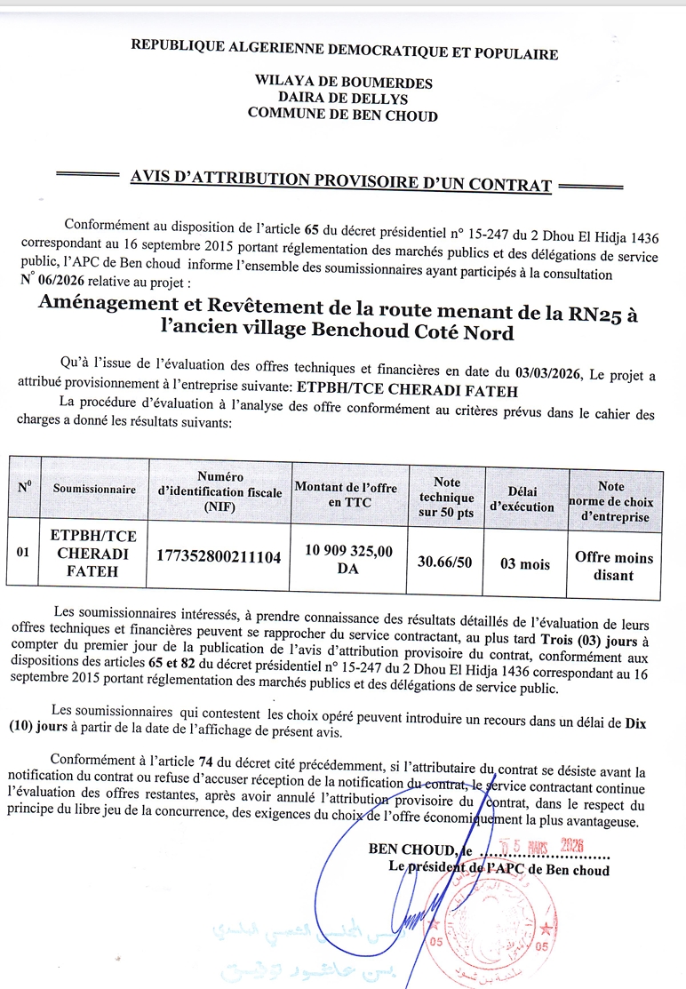 يعلن السيد رئيس المجلس الشعبي البلدي لبلدية بن شود عن منح مؤقت لإنجاز المشروع التالي
