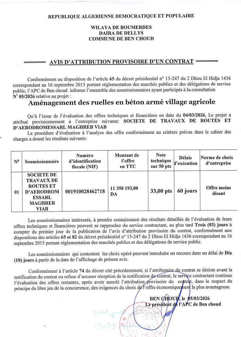 يعلن السيد رئيس المجلس الشعبي البلدي لبلدية بن شود عن منح مؤقت لإنجاز المشروع التالي