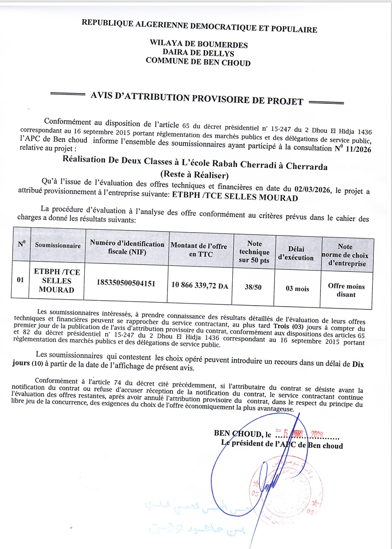 يعلن السيد رئيس المجلس الشعبي البلدي لبلدية بن شود عن منح مؤقت لإنجاز المشروع التالي