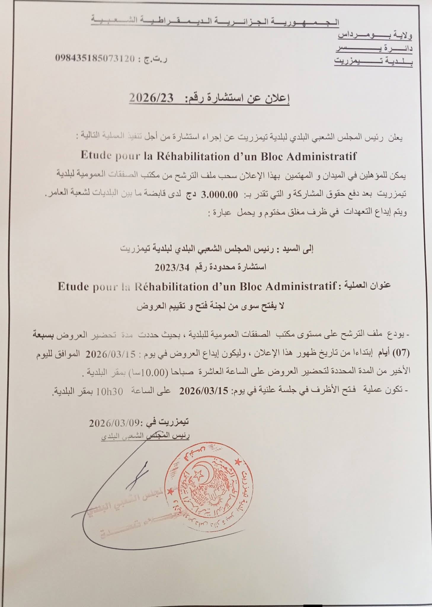 يعلن السيد رئيس المجلس الشعبي البلدي لبلدية تيمزريت عن استشارة رقم 23 لانجاز المشروع التالي