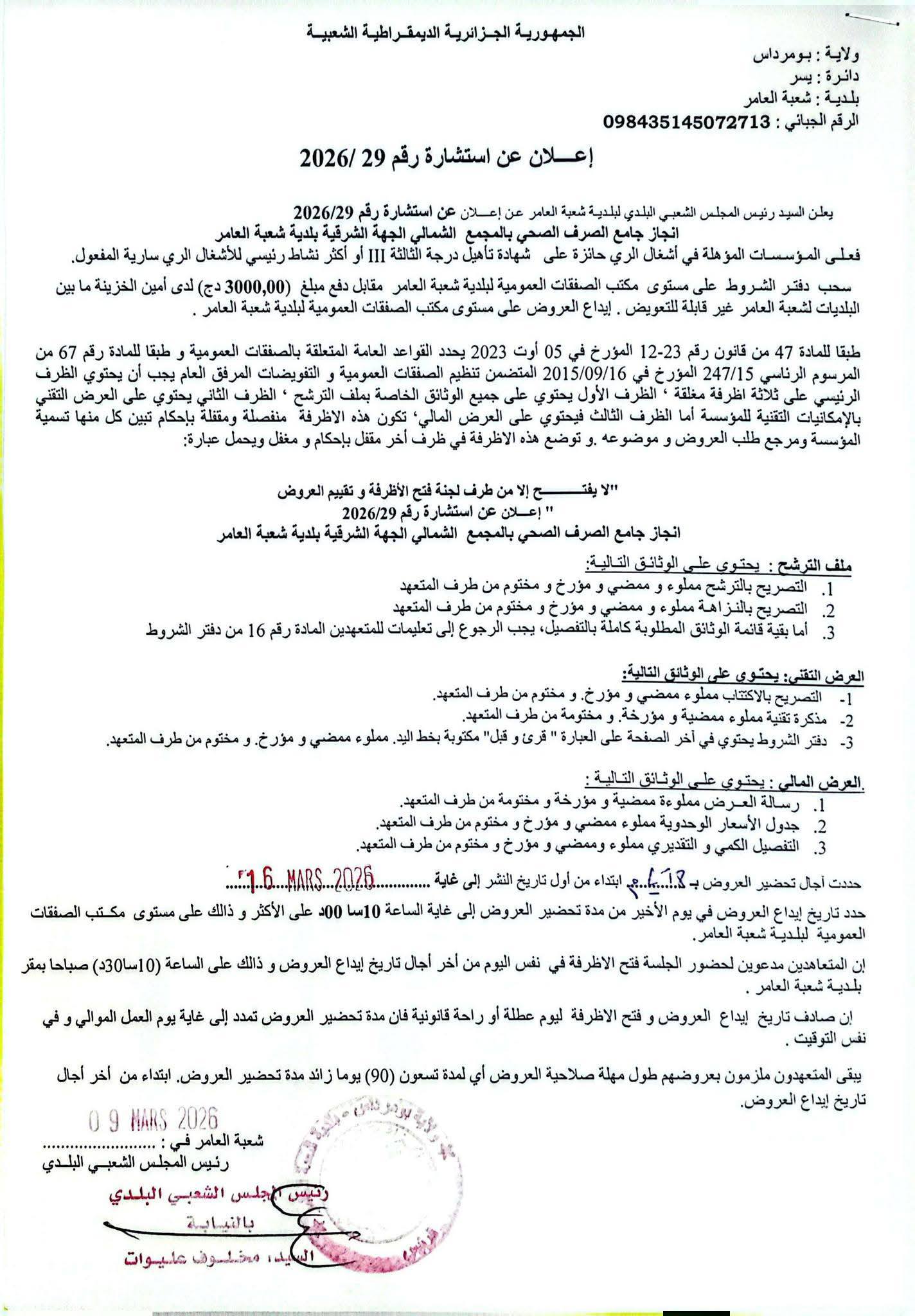 يعلن السيد رئيس المجلس الشعبي البلدي لبلدية شعبة العامر عن استشارة رقم 29 لانجاز المشروع التالي