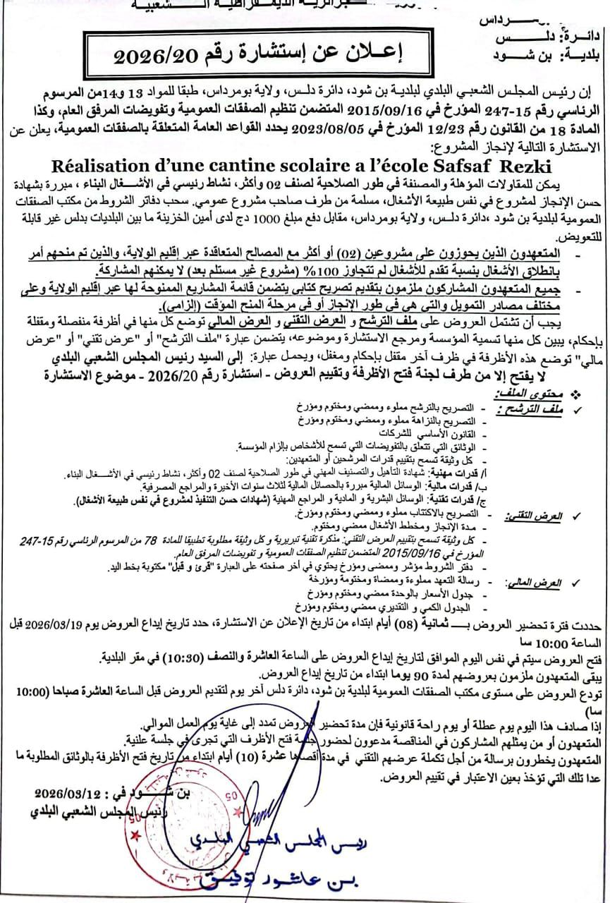 يعلن السيد رئيس المجلس الشعبي البلدي لبلدية بن شود عن استشارة رقم 20 لانجاز المشروع التالي