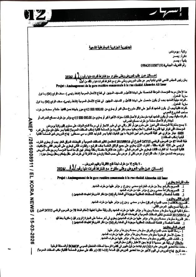 اعلان عن طلب العروض الوطني المفتوح مع اشتراط قدرات دنيا رقم 12 قصد تهيئة المحطة البرية للنفل بشارع الشهيد عكوش علي بلدية يسر