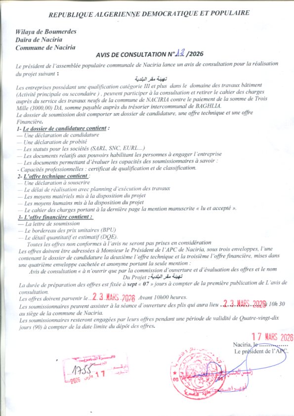 يعلن السيد رئيس المجلس الشعبي البلدي لبلدية الناصرية عن استشارة رقم 12 لانجاز المشروع التالي