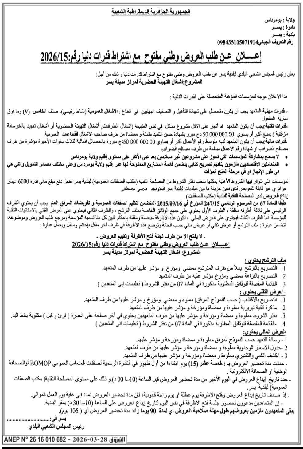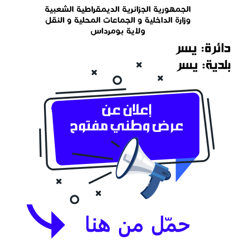 يعلن رئيس المجلس الشعبي البلدية لبلدية يسر عن اعلان طلب العروض وطني مفتوح مع اشتراط قدرات دنيا رقم 15