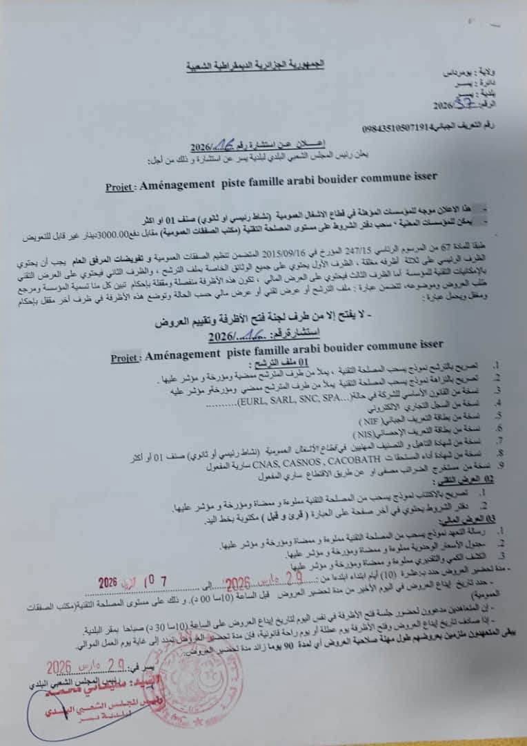 يعلن السيد رئيس المجلس الشعبي البلدي لبلدية يسر عن استشارة رقم 16 لانجاز المشروع التالي