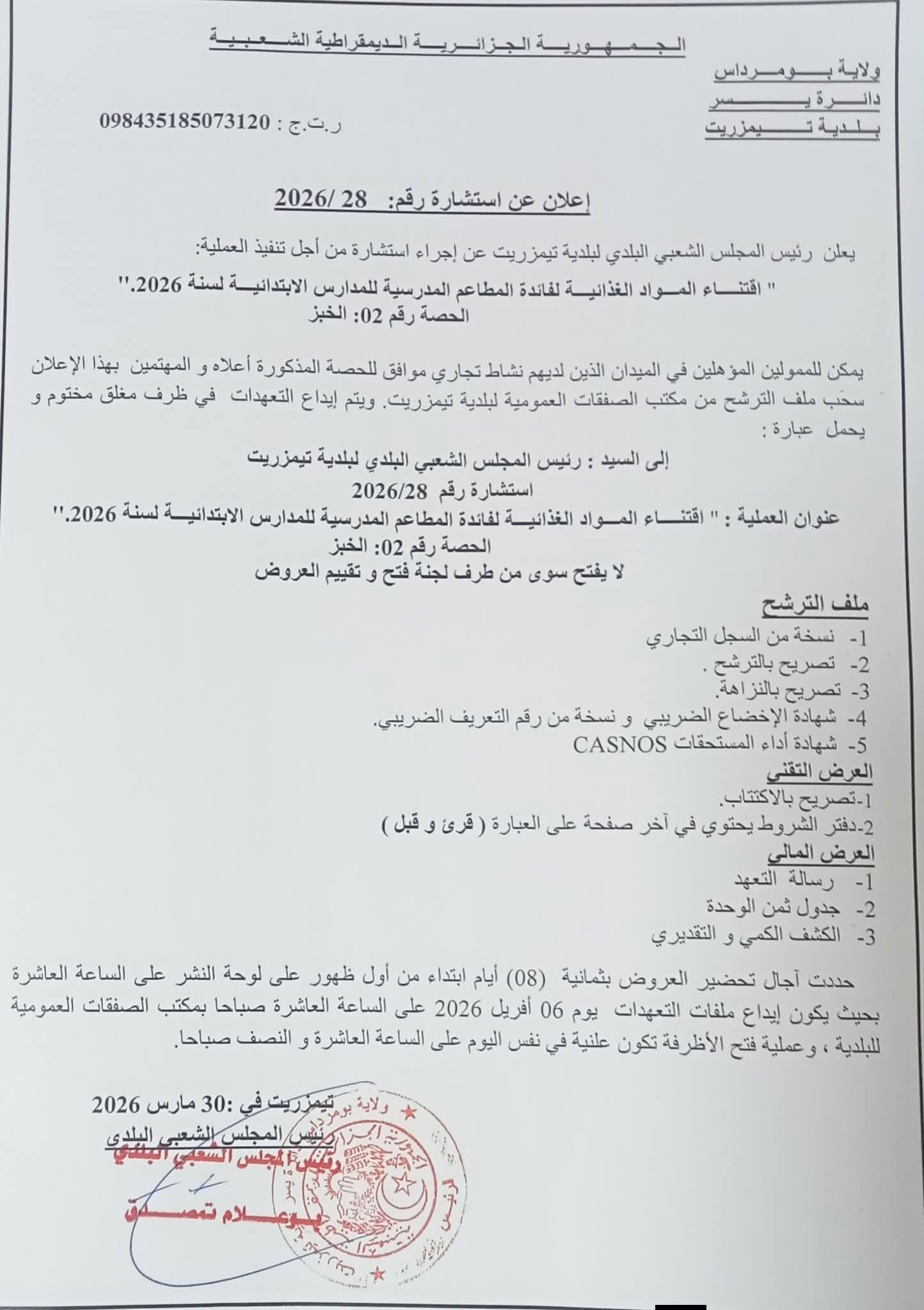 يعلن السيد رئيس المجلس الشعبي البلدي لبلدية تيمزريت عن استشارة رقم 28 لانجاز المشروع التالي
