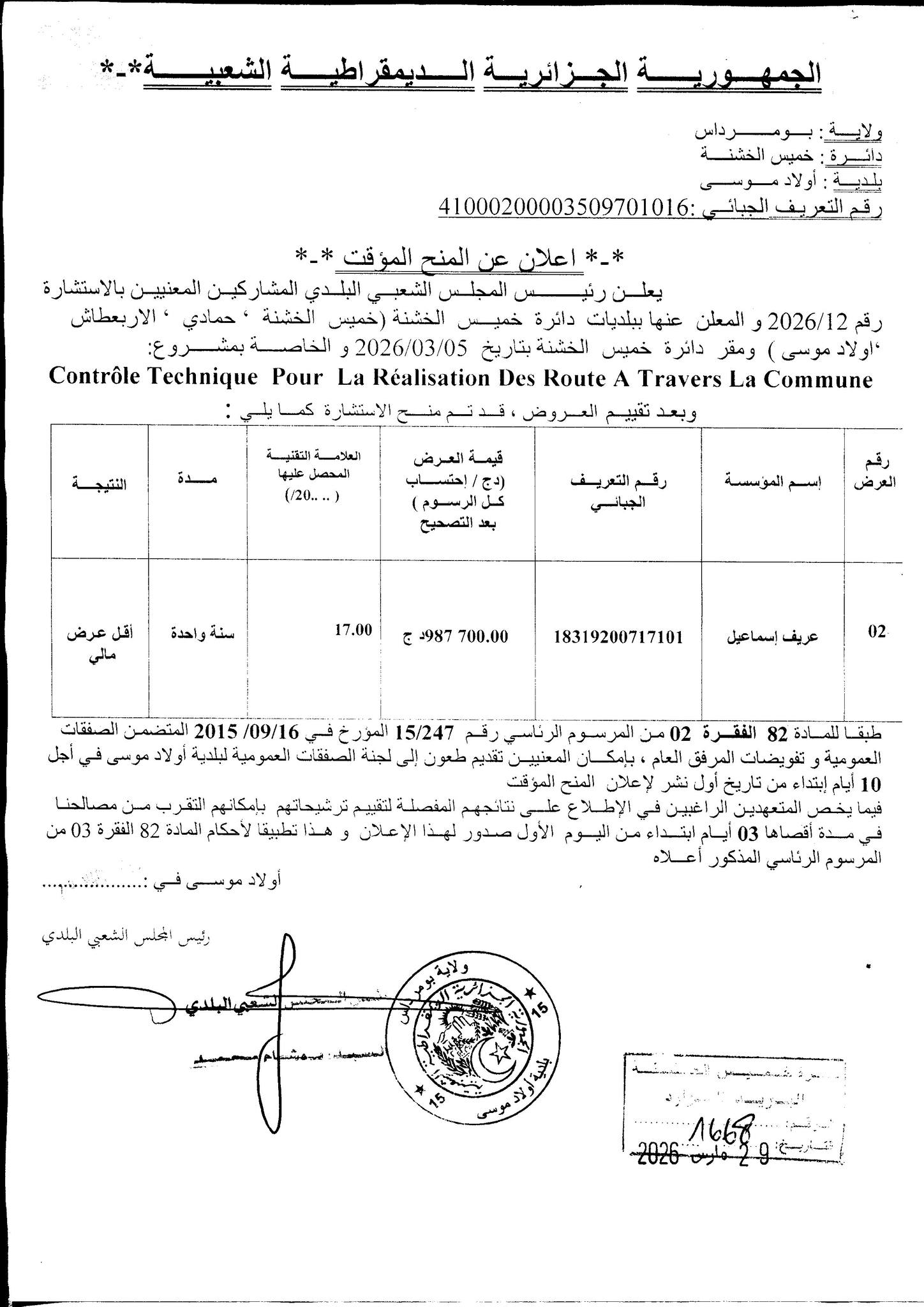 يعلن السيد رئيس المجلس الشعبي البلدي لبلدية أولاد موسى عن منح مؤقت لانجاز المشروع التالي