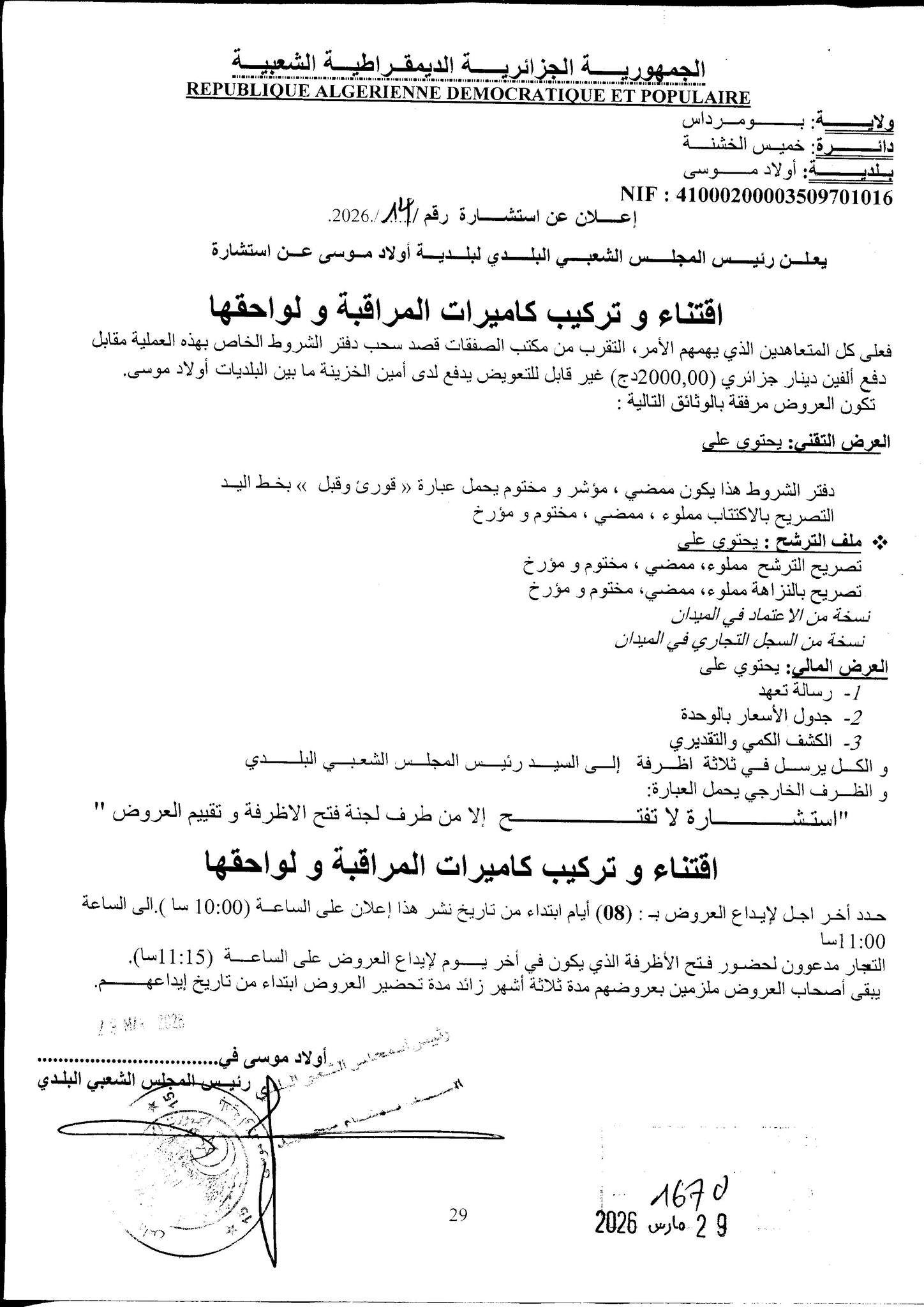يعلن السيد رئيس المجلس الشعبي البلدي لبلدية أولاد موسى عن استشارة رقم 14 لانجاز المشروع التالي