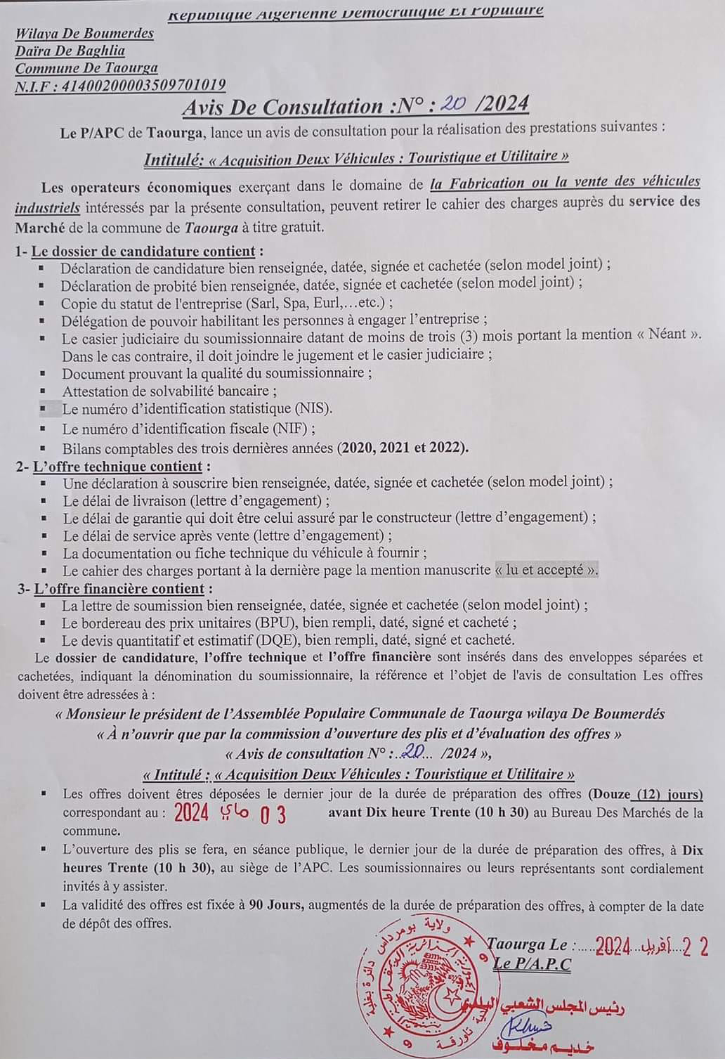 إعلان عن استشارة رقم 20 بلدية تاورقة