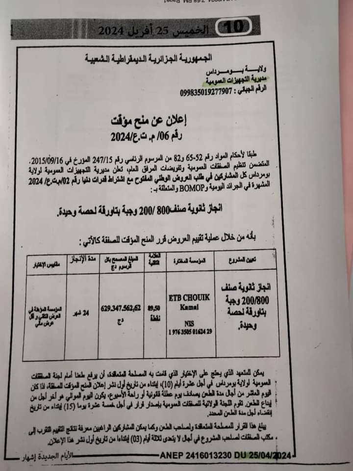 إعلان عن منح مؤقت مديرية التجهيزات العمومية انجاز ثانوية صنف 200/800 وجبة بتاورقة لحصة وحيدة
