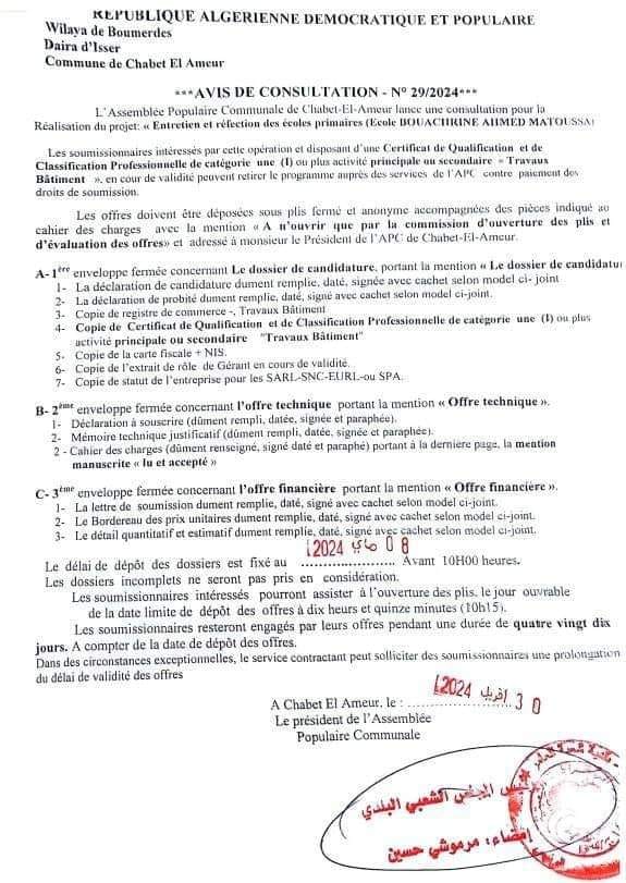 إعلان عن استشارة رقم 29 بلدية شعبة العامر