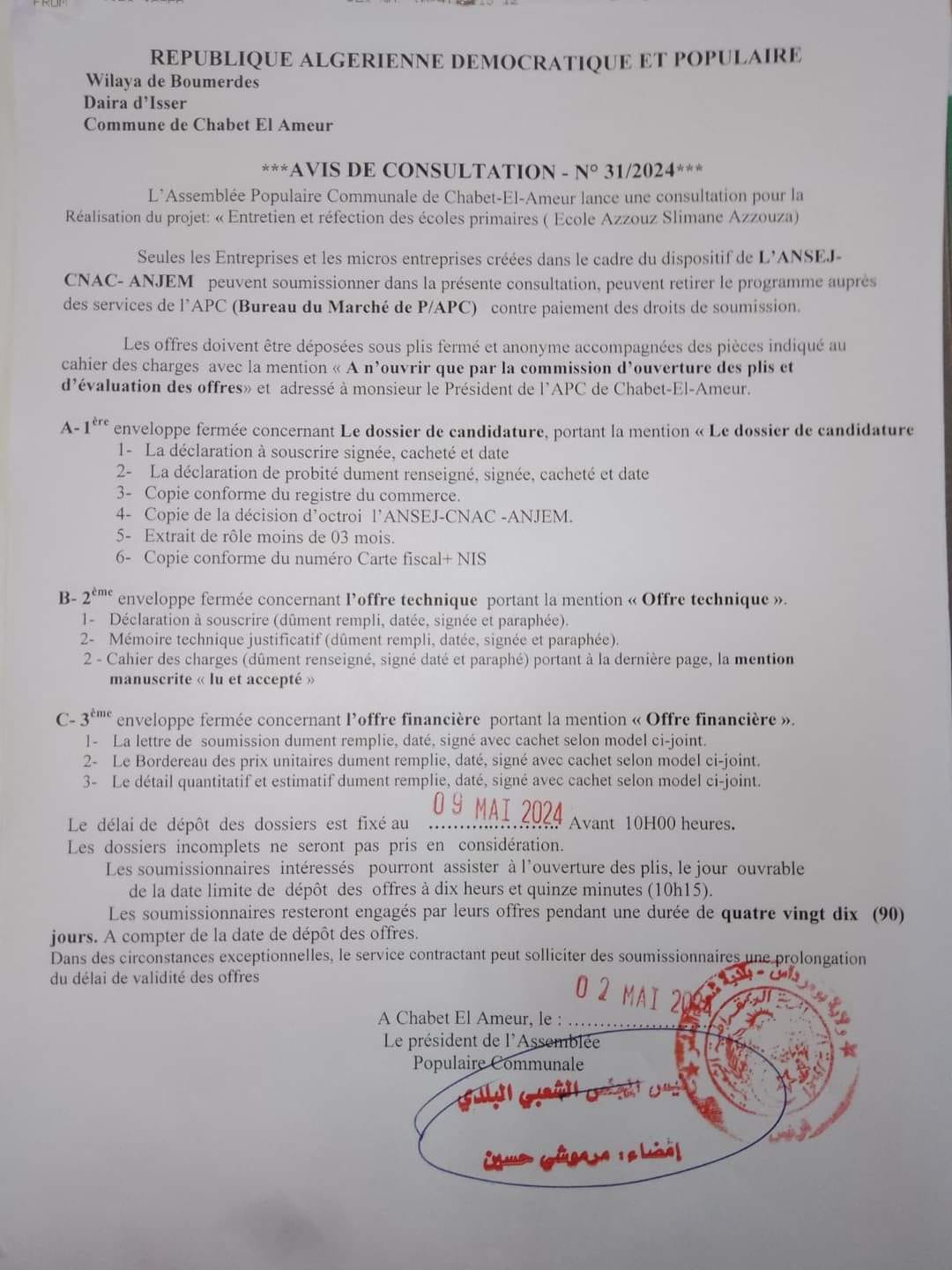 إعلان عن استشارة رقم 31 بلدية شعبة العامر