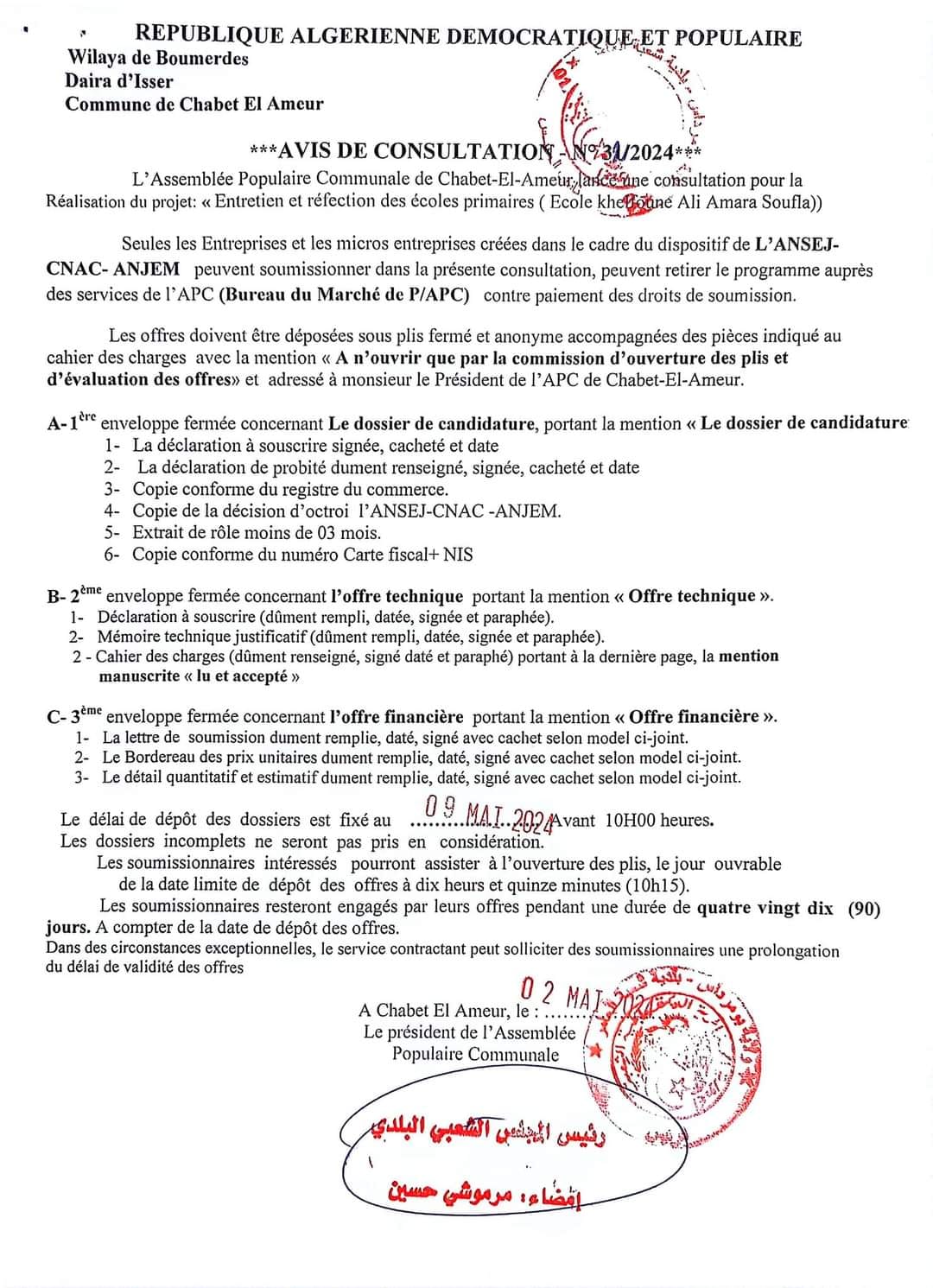 إعلان عن استشارة رقم 32 بلدية شعبة العامر