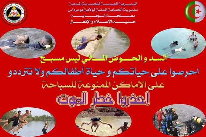 اعلان تحسيسي لمديرية الحماية المدنية لولاية بومرداس حول مخاطر الأماكن الممنوعة من السباحة