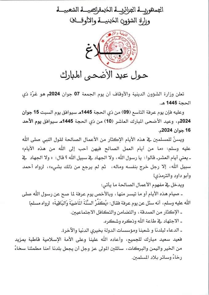 بلاغ حول عيد الأضحى المبارك