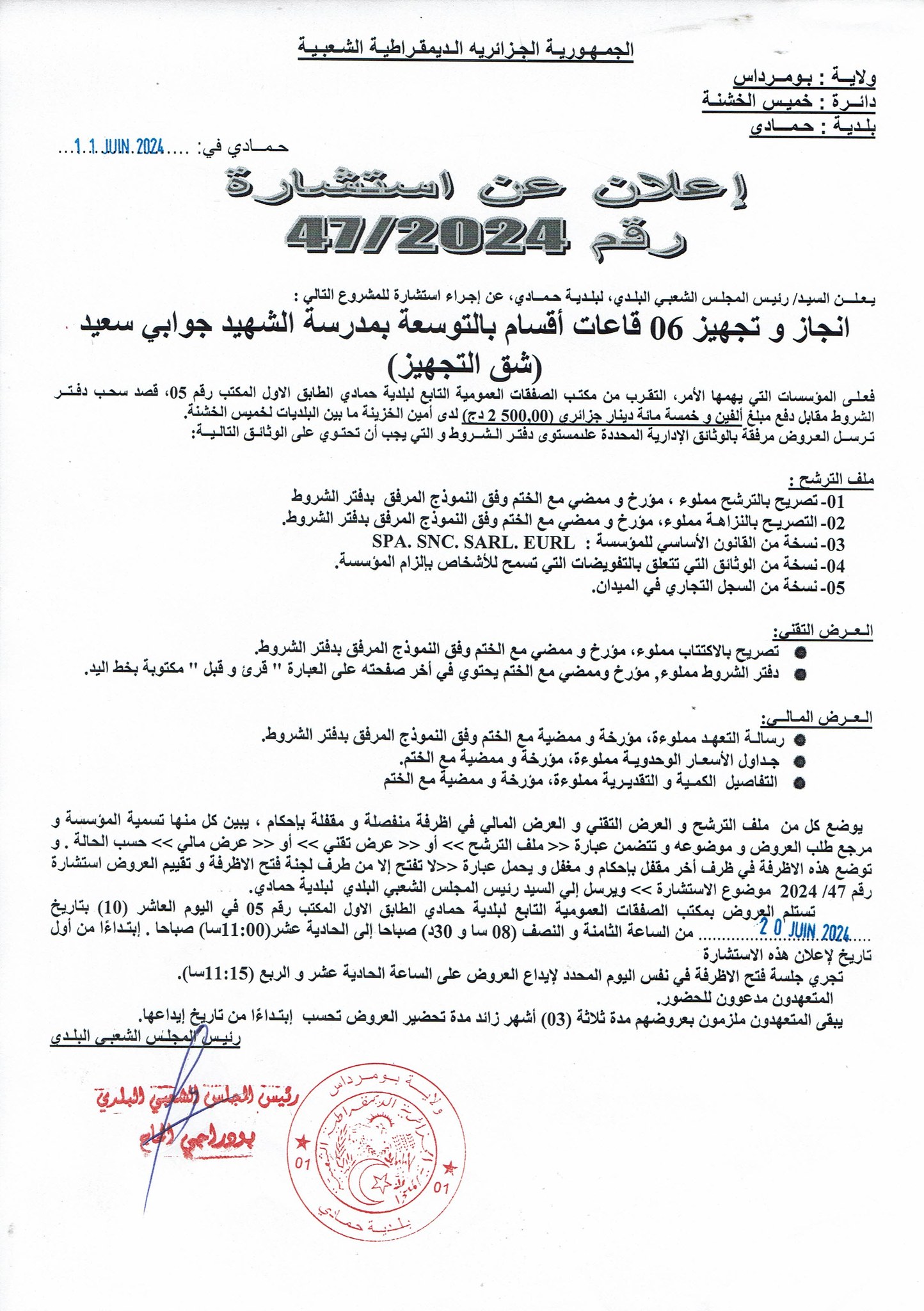 اعلان عن استشارة بلدية حمادي رقم 47/2024