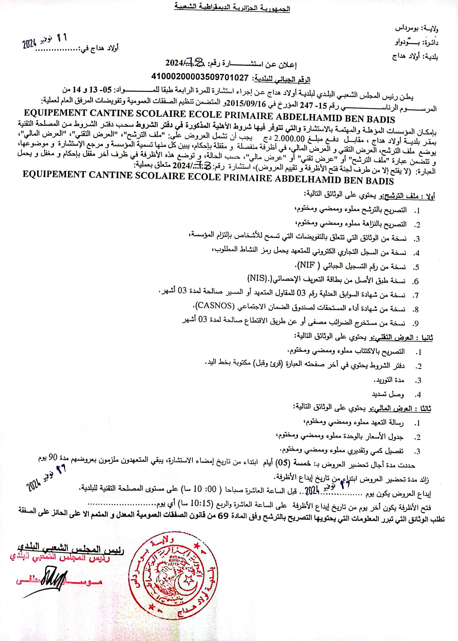 إعلان عن استشارة رقم 78 بلدية أولاد هداج