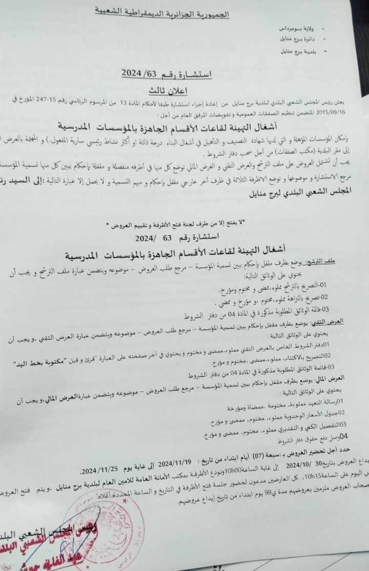 إعلان عن استشارة رقم 63 بلدية برج منايل