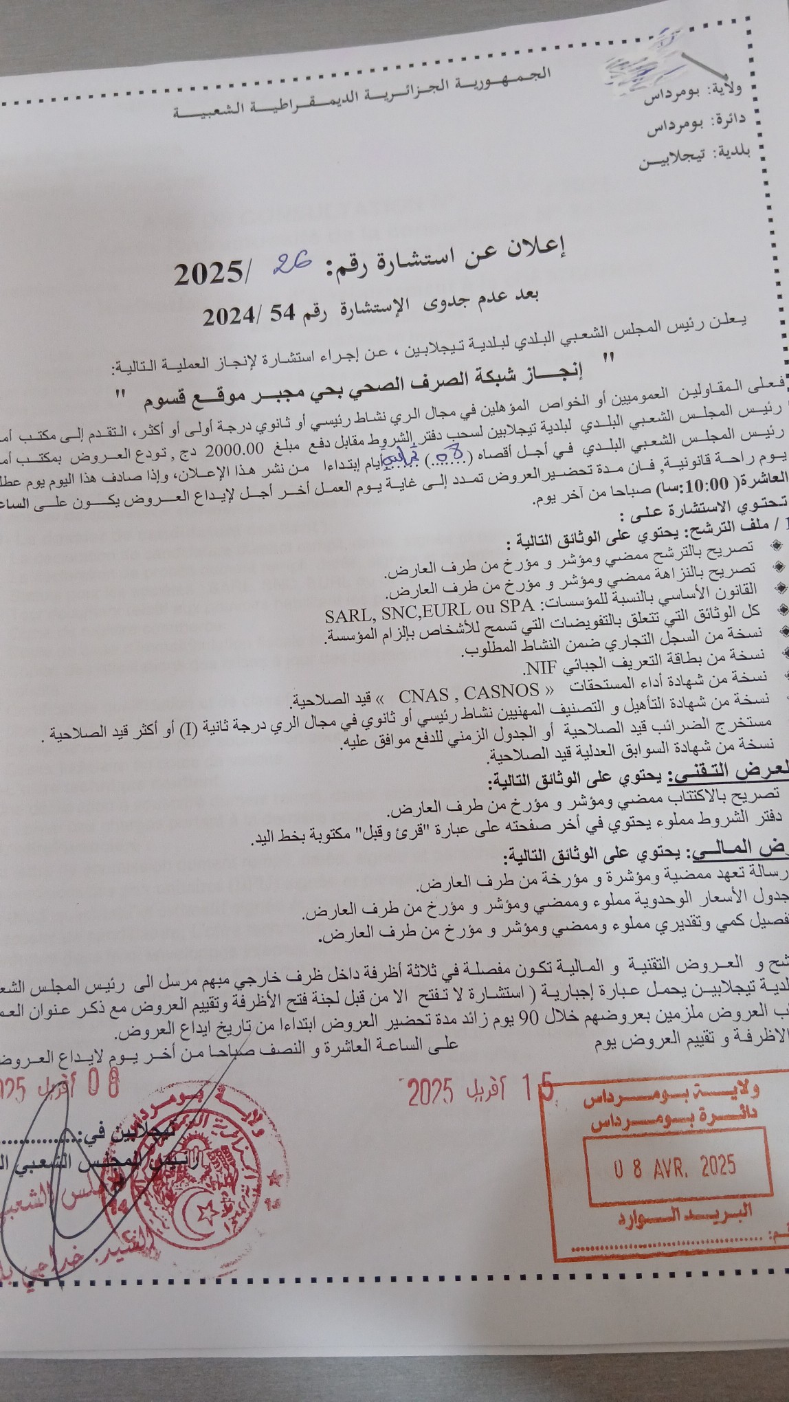 يعلن رئيس المجلس الشعبي البلدي لبلدية تيجلابين، عن اجراء استشارة رقم 26