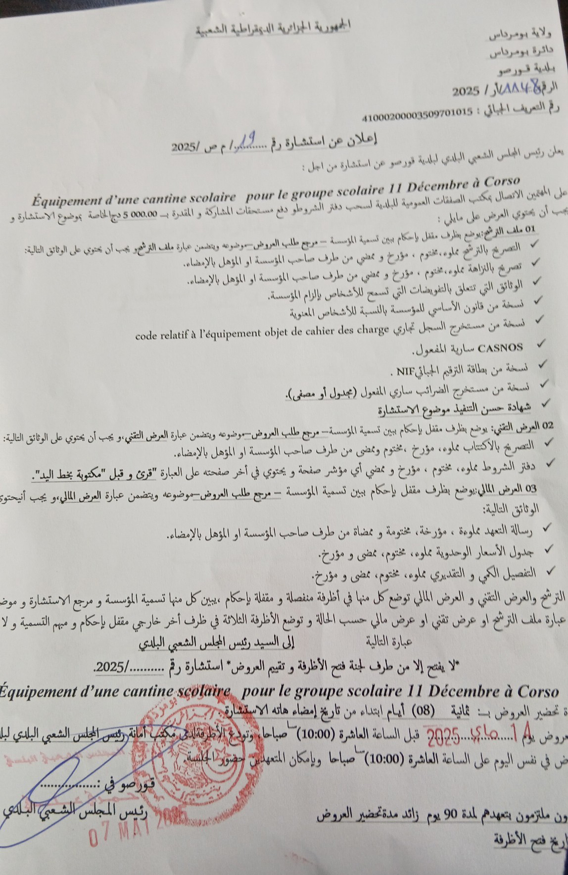 يعلن رئيس المجلس الشعبي البلدي لبلدية قورصو، عن اجراء استشارة رقم 19