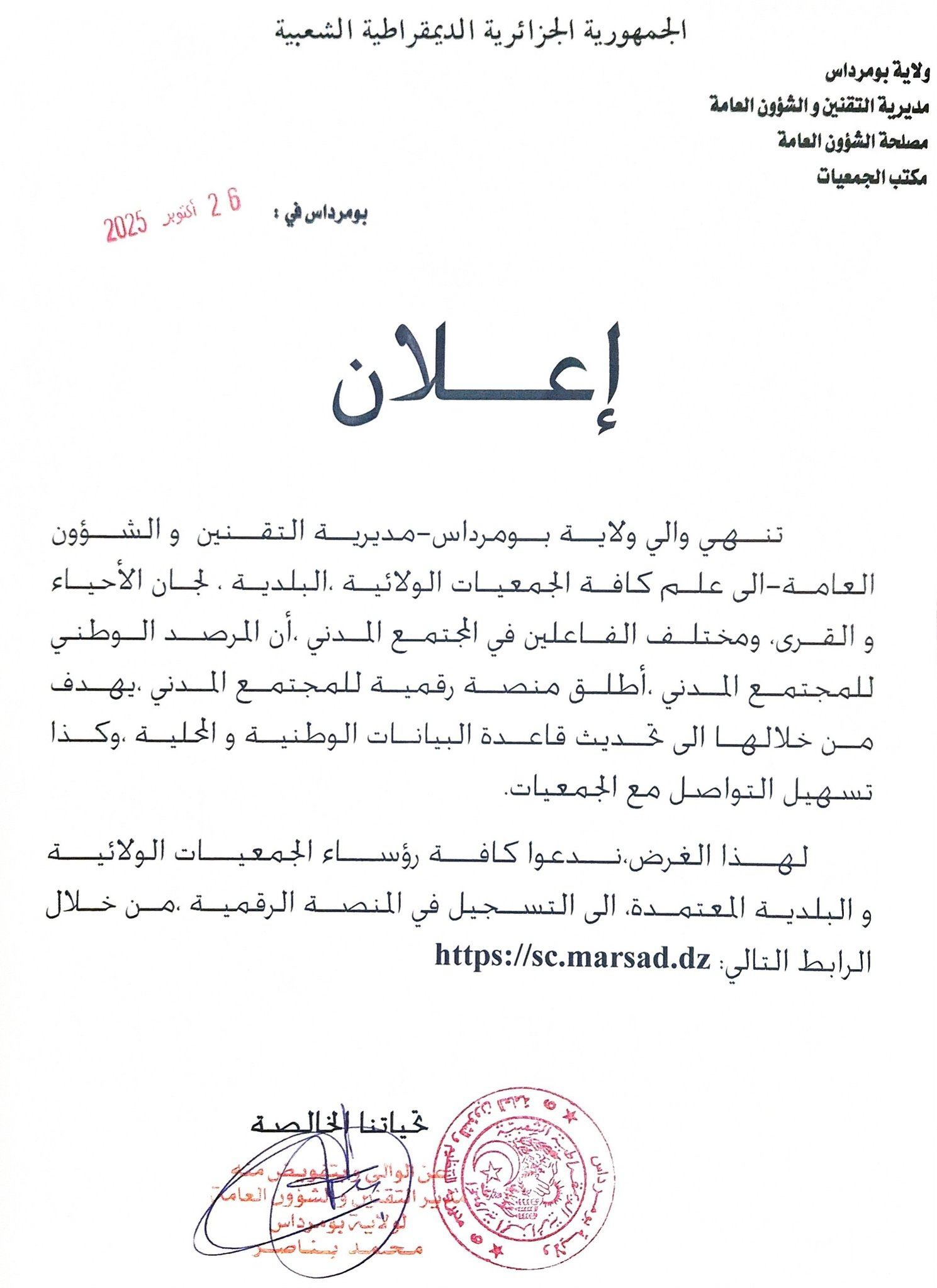 تنهي والي ولاية بومرداس - مديرية التقنين والشؤون العامة - إلى علم كافة الجمعيات الولائية والبلدية، لجان الأحياء والقرى، ومختلف الفاعلين في المجتمع المدني، أن المرصد الوطني للمجتمع المدني أطلق منصة رقمية للمجتمع المدني، يهدف من خلالها إلى تحديث قاعدة البيانات الوطنية والمحلية، وكذا تسهيل التواصل مع الجمعيات، ولهذا الغرض، تُدعى كافة رؤساء الجمعيات الولائية والبلدية المعتمدة إلى التسجيل في المنصة الرقمية عبر الرابط التالي: