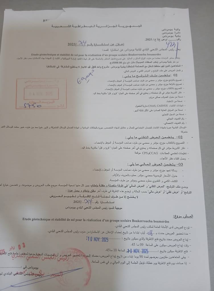 يعلن رئيس المجلس الشعبي البلدي لبلدية بومرداس، عن اجراء استشارة رقم 74