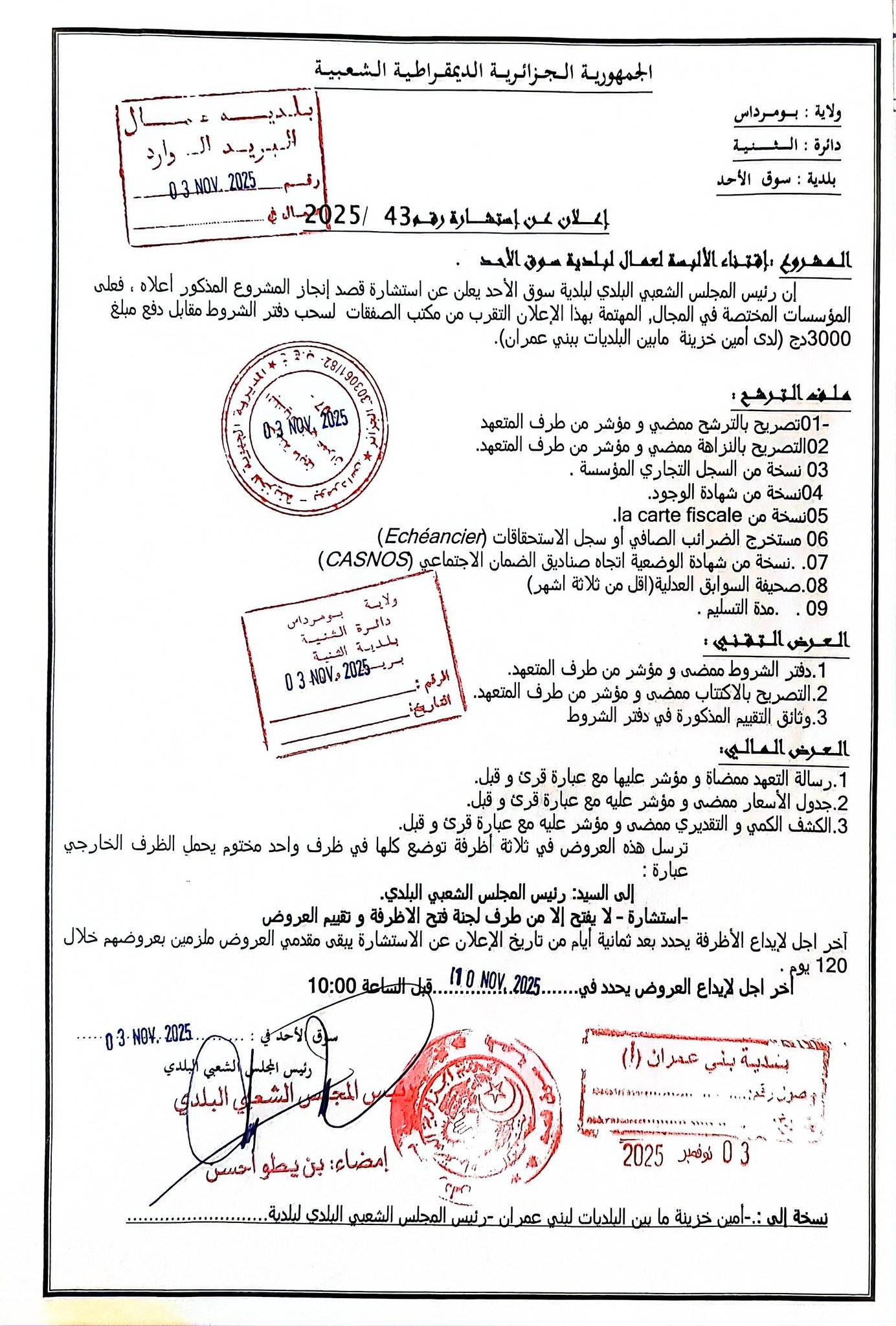 يعلن رئيس المجلس الشعبي البلدي لبلدية سوق الحد، عن اجراء استشارة رقم 43