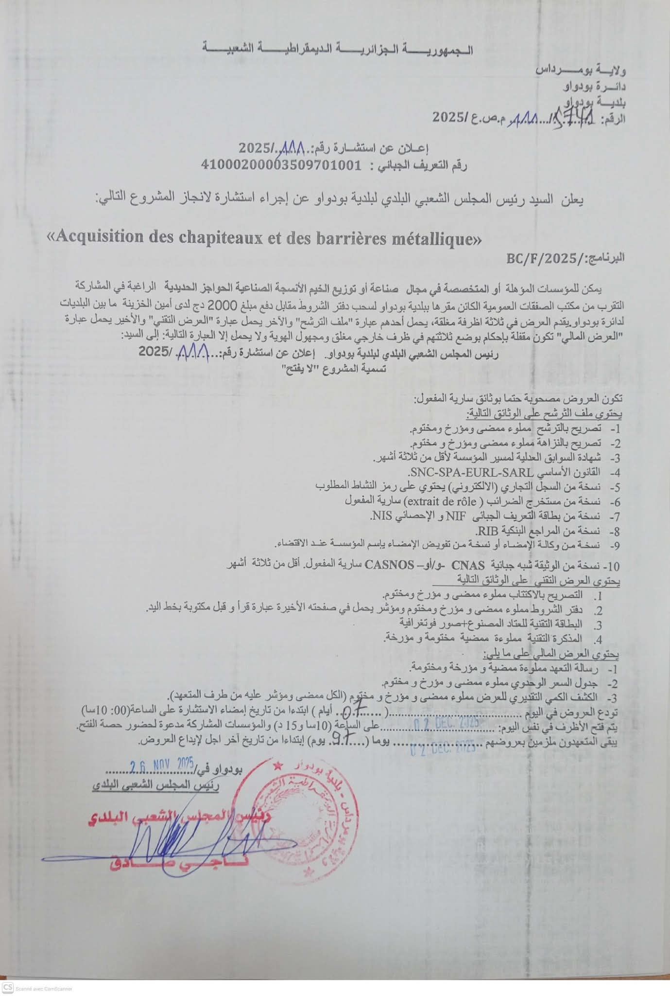 يعلن رئيس المجلس الشعبي البلدي لبلدية بودواو، عن اجراء استشارة رقم 111