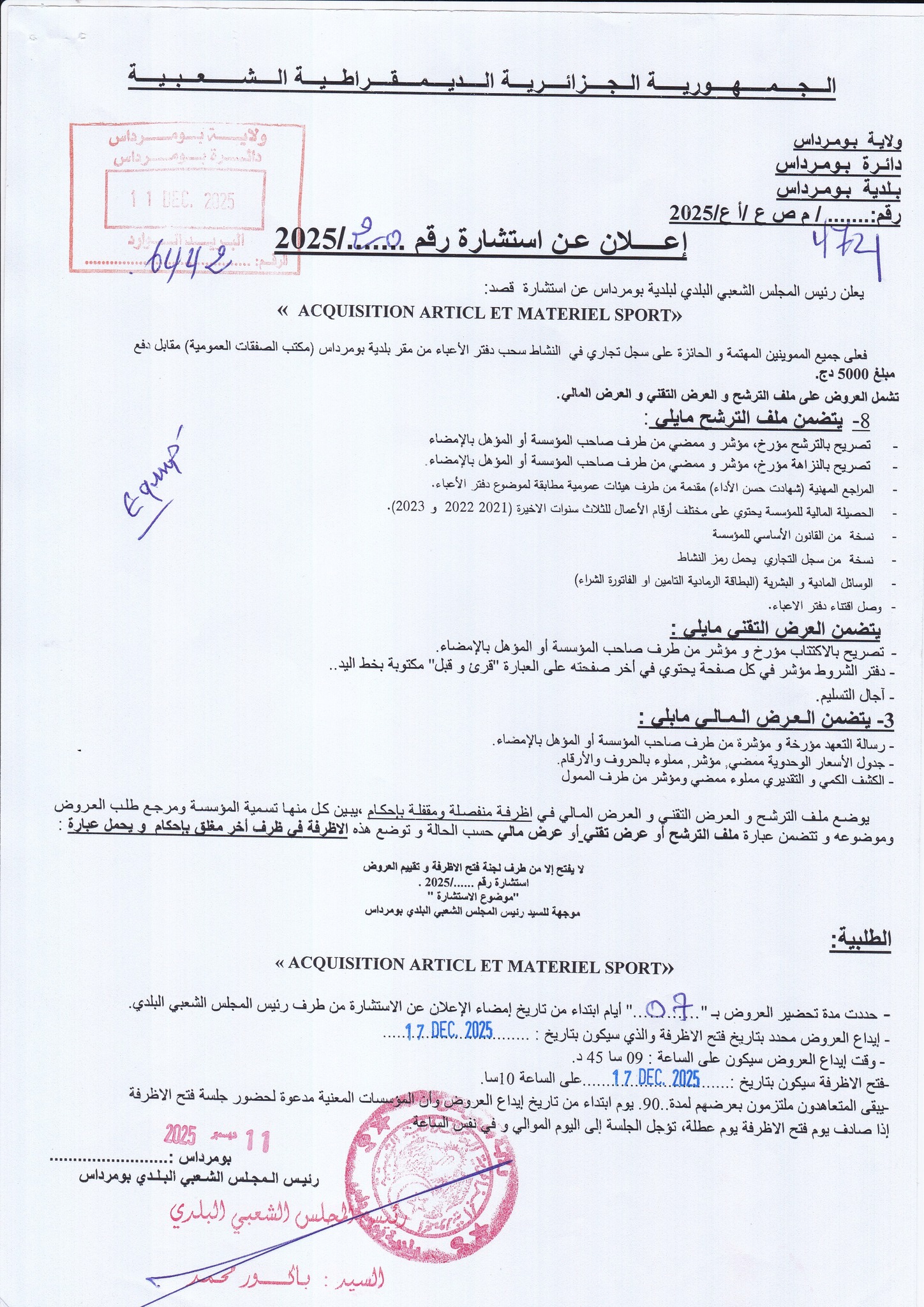 :يعلن السيد رئيس المجلس الشعبي البلدي لبلدية بومرداس عن الاستشارة رقم 20 لانجاز المشروع التالي