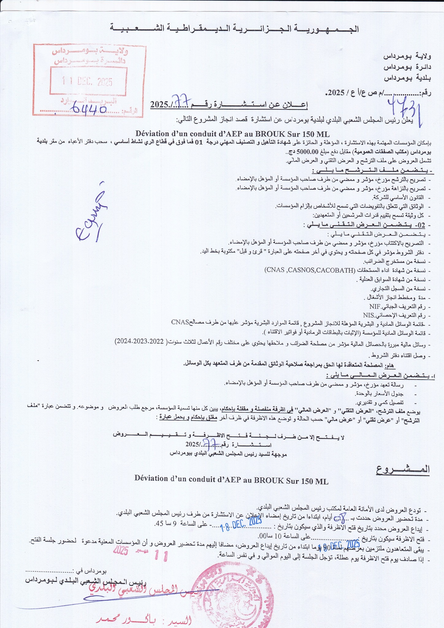 :يعلن السيد رئيس المجلس الشعبي البلدي لبلدية بومرداس عن الاستشارة رقم 77 لانجاز المشروع التالي