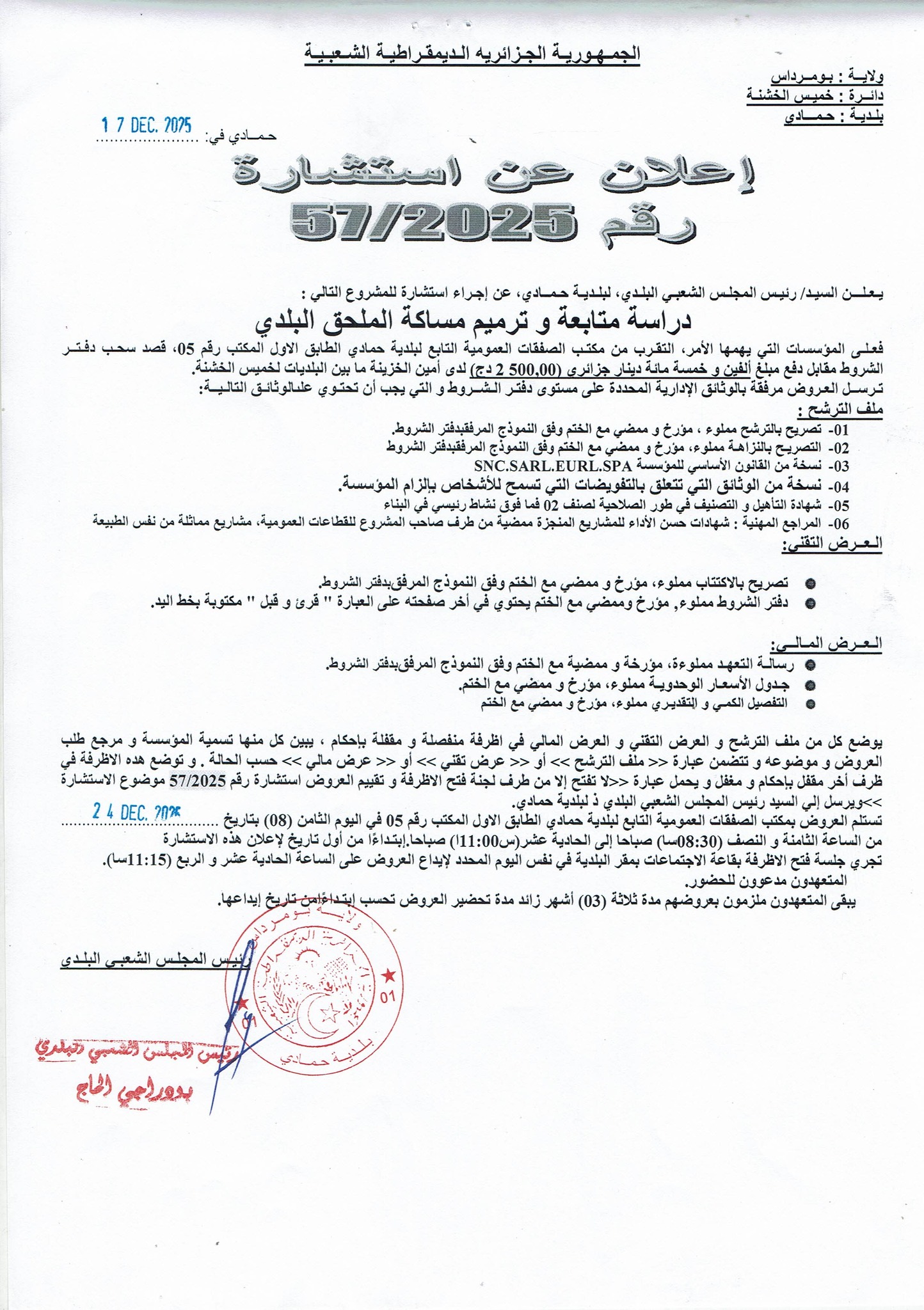 :يعلن السيد رئيس المجلس الشعبي البلدي لبلدية حمادي عن الاستشارة رقم 57 لانجاز المشروع التالي