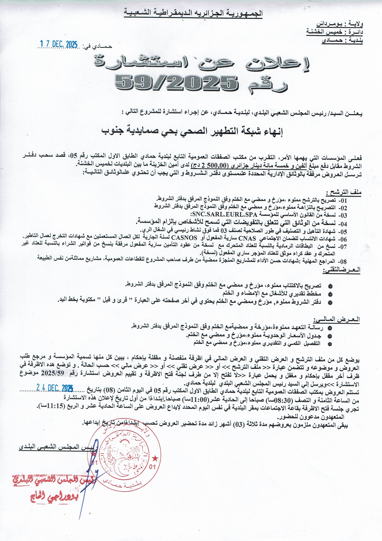 :يعلن السيد رئيس المجلس الشعبي البلدي لبلدية حمادي عن الاستشارة رقم 59 لانجاز المشروع التالي