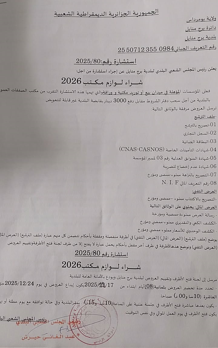:يعلن السيد رئيس المجلس الشعبي البلدي لبلدية برج منايل عن الاستشارة رقم 80 لانجاز المشروع التالي