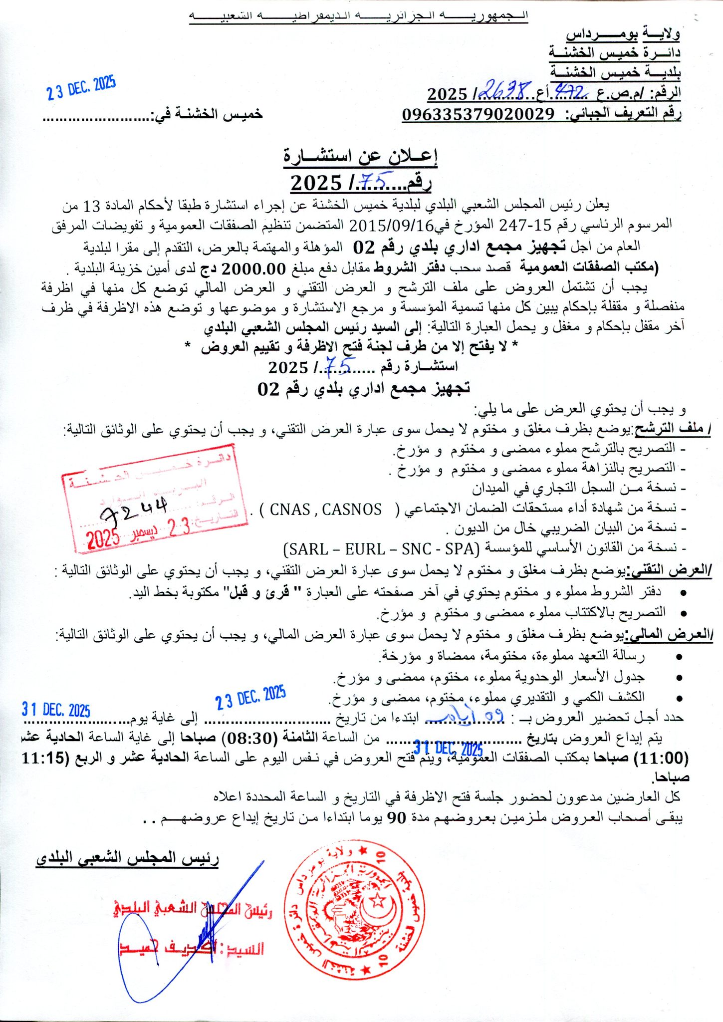 :يعلن السيد رئيس المجلس الشعبي البلدي لبلدية خميس الخشنة عن الاستشارة رقم 75 لانجاز المشروع التالي