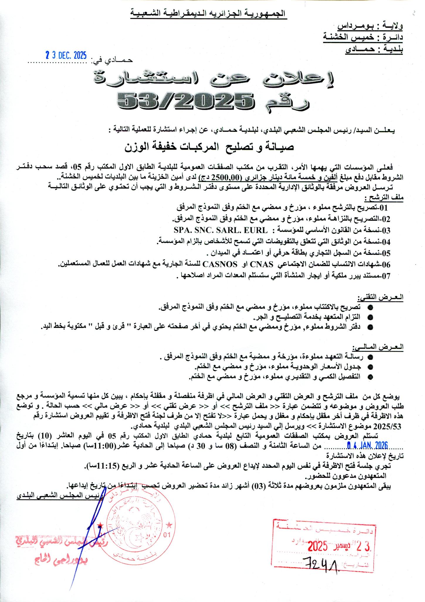 :يعلن السيد رئيس المجلس الشعبي البلدي لبلدية حمادي عن الاستشارة رقم 53 لانجاز المشروع التالي