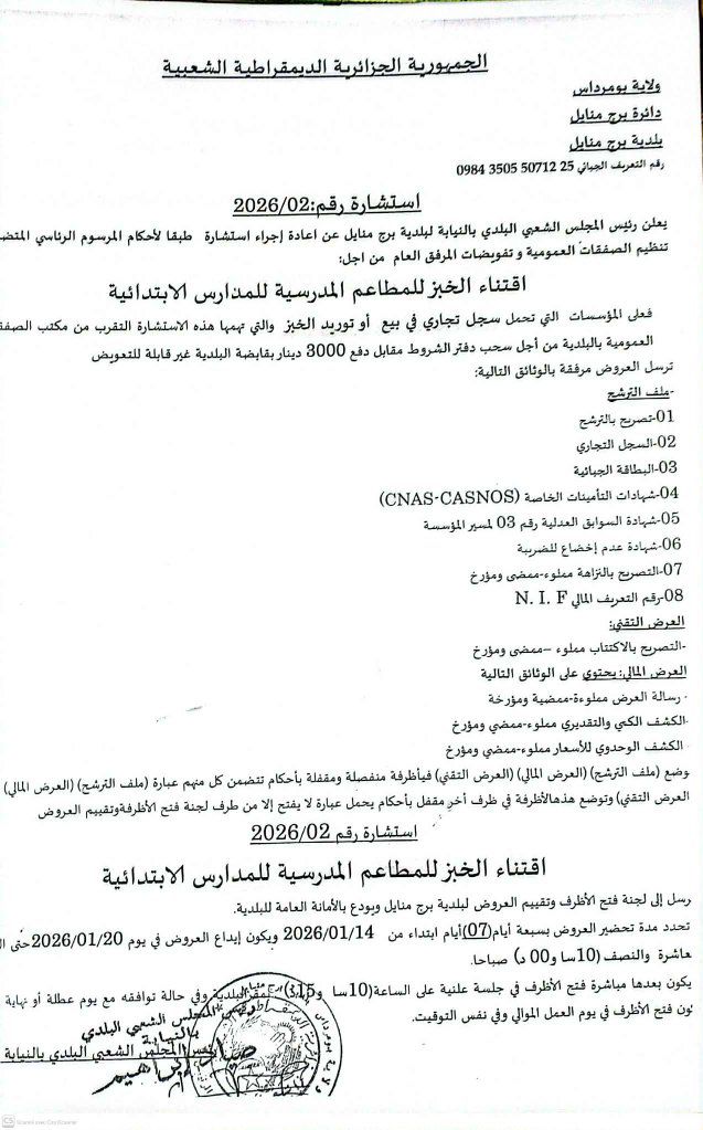 :يعلن السيد رئيس المجلس الشعبي البلدي لبلدية برج منايل عن الاستشارة رقم 02 لانجاز المشروع التالي
