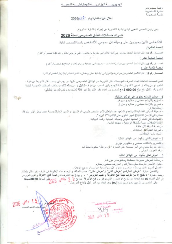 :يعلن السيد رئيس المجلس الشعبي البلدي لبلدية الناصرية عن الاستشارة رقم 01 لانجاز المشروع التالي