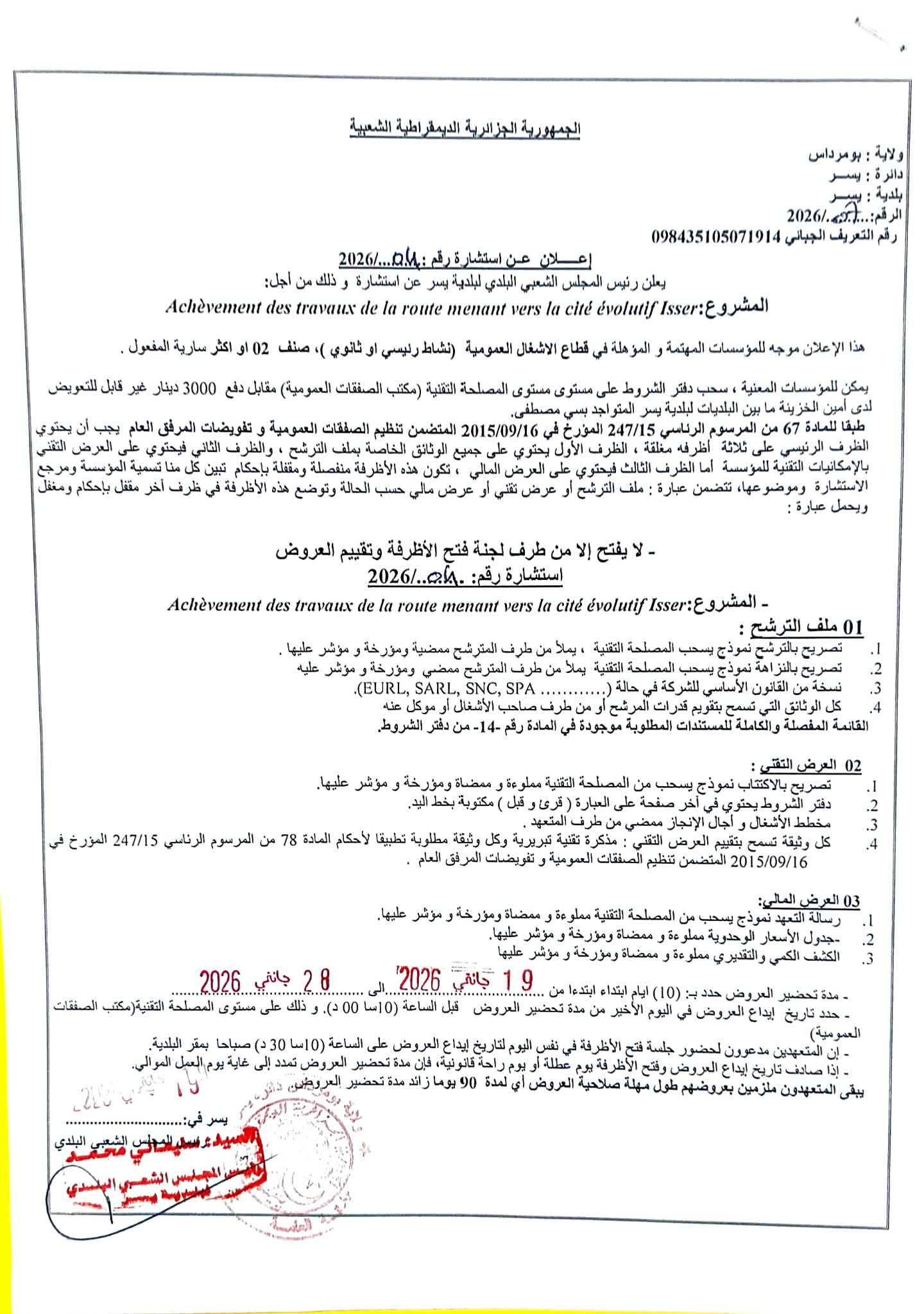 :يعلن السيد رئيس المجلس الشعبي البلدي لبلدية يسر عن الاستشارة رقم 04 لانجاز المشروع التالي