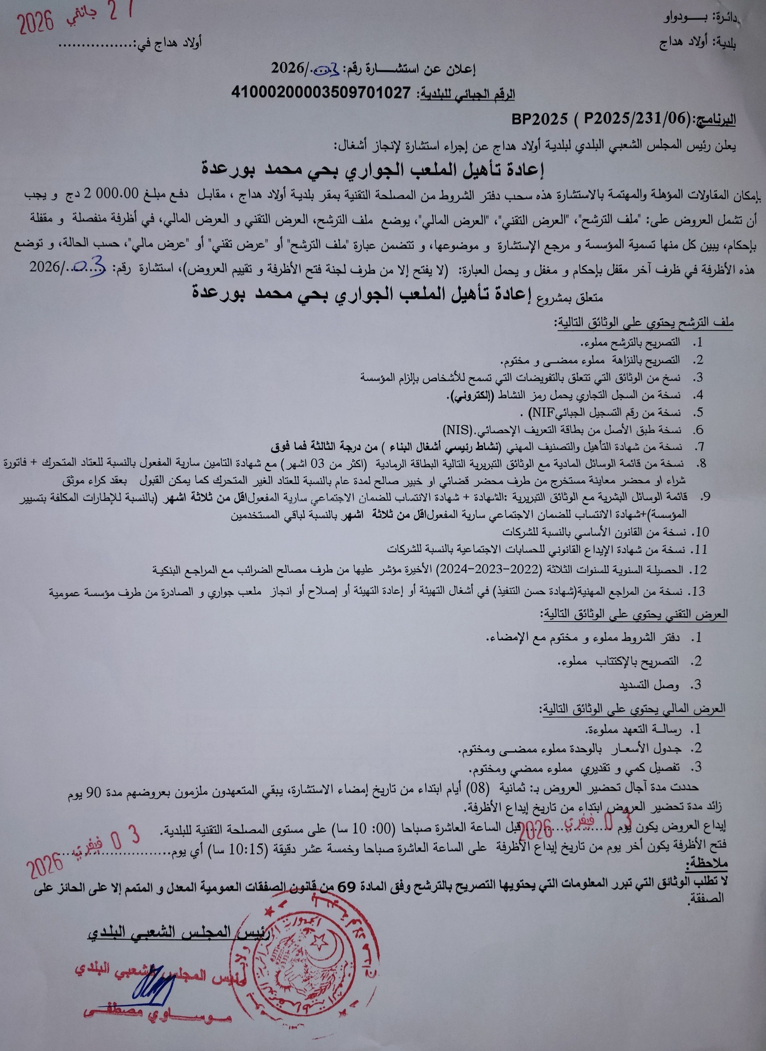 يعلن السيد رئيس المجلس الشعبي البلدي لبلدية أولاد هداج عن الاستشارة رقم 03 لانجاز المشروع التالي