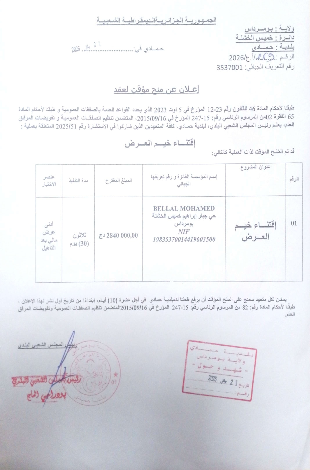 يعلن رئيس المجلس الشعبي البلدي لبلدية حمادي عن منح مؤقت لعقد اقتناء خيم العرض