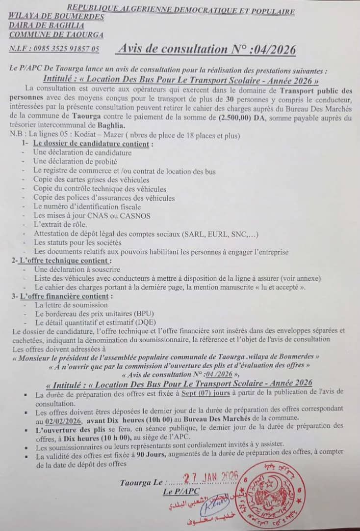 يعلن السيد رئيس المجلس الشعبي البلدي لبلدية تاورقة عن الاستشارة رقم 04 لانجاز المشروع التالي