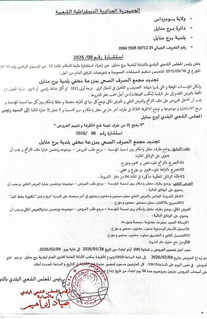يعلن السيد رئيس المجلس الشعبي البلدي لبلدية برج منايل عن الاستشارة رقم 08 لانجاز المشروع التالي