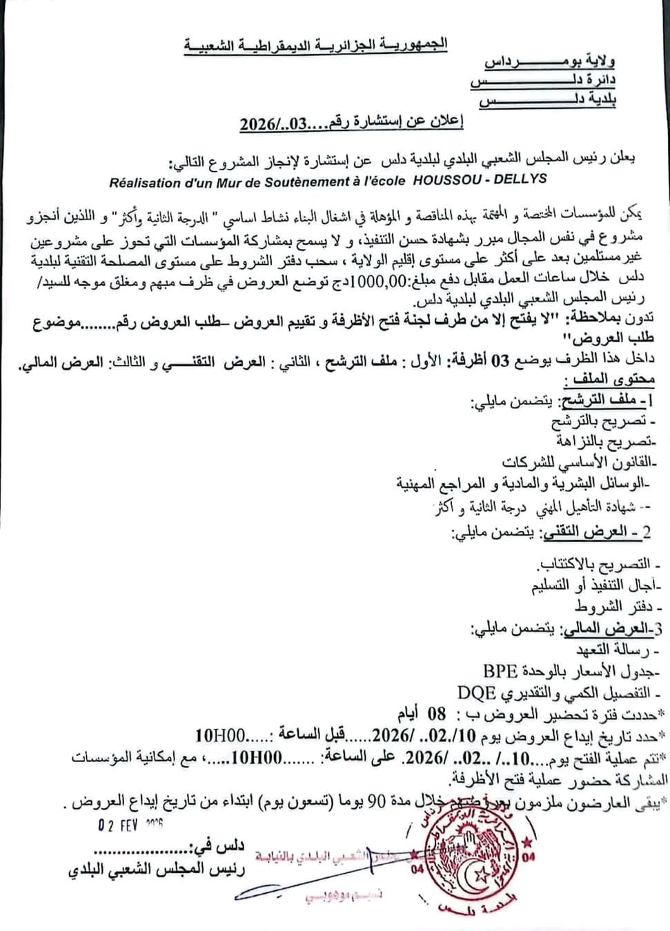 :يعلن السيد رئيس المجلس الشعبي البلدي لبلدية دلس عن الاستشارة رقم 03 لانجاز المشروع التالي