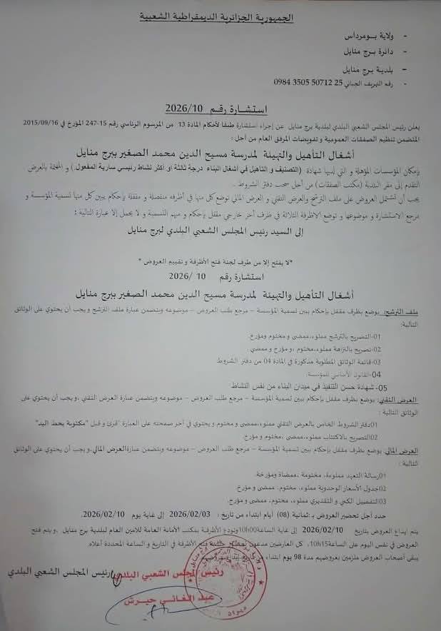 :يعلن السيد رئيس المجلس الشعبي البلدي لبلدية برج منايل عن الاستشارة رقم 10 لانجاز المشروع التالي