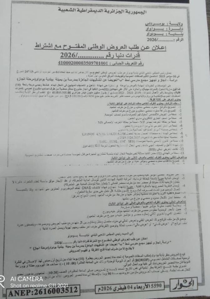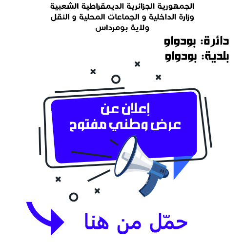 يعلن رئيس المجلس الشعبي البلدي بيلدية بودواو عن طلب عروض وطني مفتوح مع اشتراط قدرات دنيا لانجاز المشروع التالي