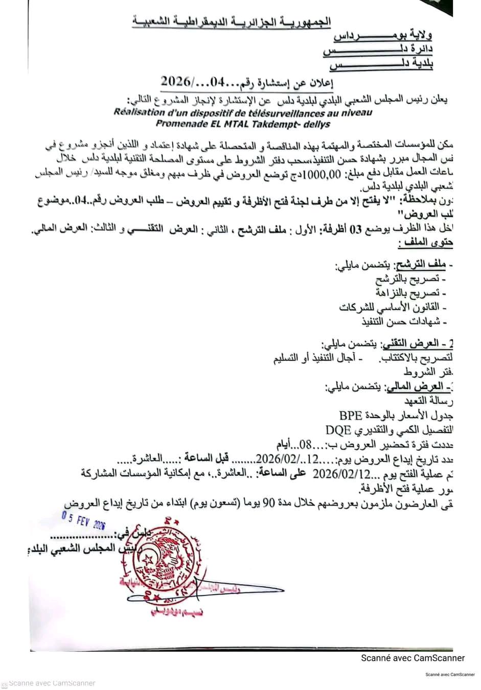 :يعلن السيد رئيس المجلس الشعبي البلدي لبلدية دلس عن الاستشارة رقم 04 لانجاز المشروع التالي