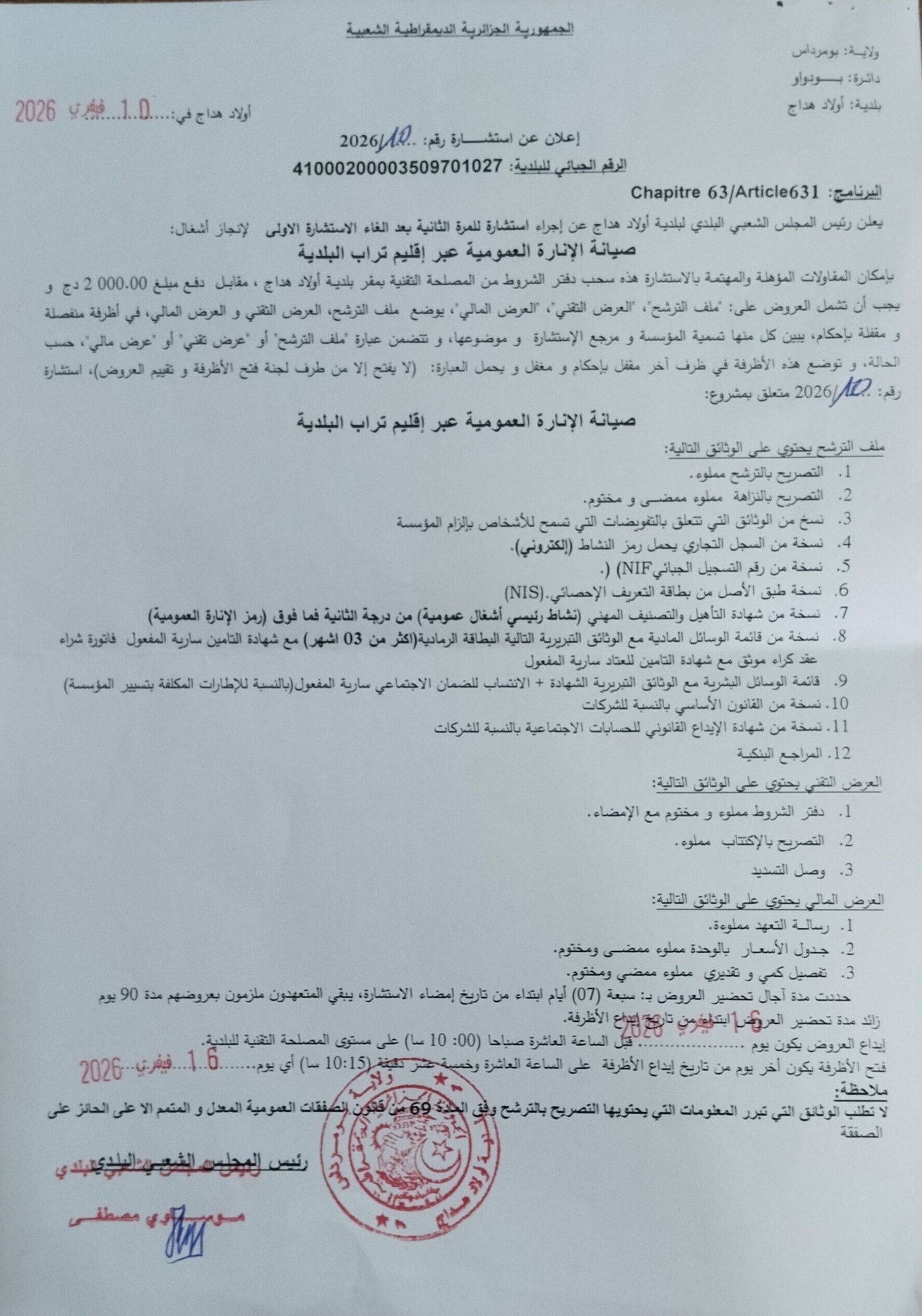 :يعلن السيد رئيس المجلس الشعبي البلدي لبلدية أولاد هداج عن الاستشارة رقم 10 لانجاز المشروع التالي