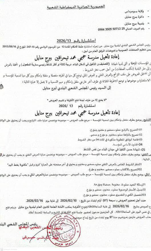 :يعلن السيد رئيس المجلس الشعبي البلدي لبلدية برج منايل عن الاستشارة رقم 13 لانجاز المشروع التالي